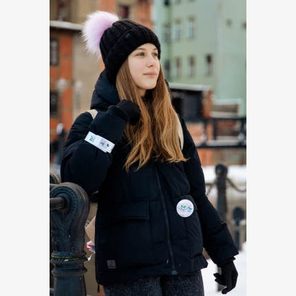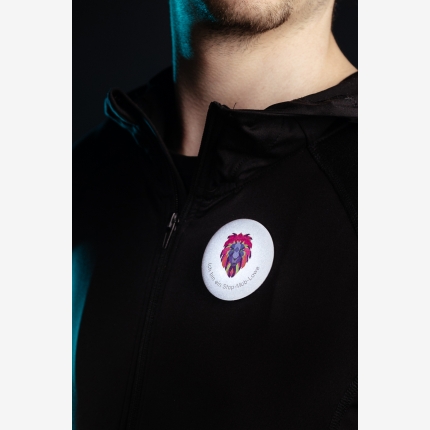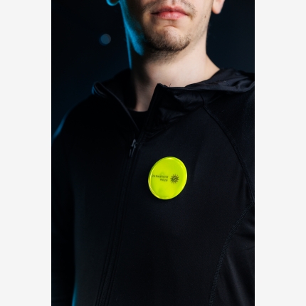 Reflective button/badge attached to garments to improve visibility for pedestrians.