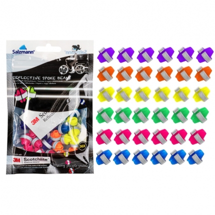 Reflective beads for bicycle spokes are a great gadget for every cyclist. You can easily install them on your bike or your child's bike. Bicycle spoke beads will make you more visible on the road, which means you're better protected and safer. The beads are coated with a highly reflective branded foil, which reflects the light with its entire surface. They are also very durable and will not wear out for a long time. Packaged in sets of 36 pieces. Covered by refloactive material 3M Schotchlite.