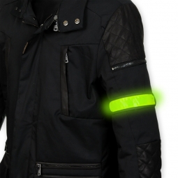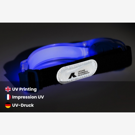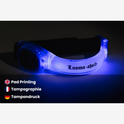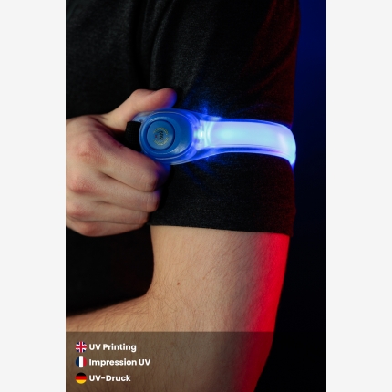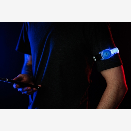 The product combines two functions: reflector and LED in one. Use of LED by switching on as required. Waterproof LED wristband. Light reflection achieved by a reflective foil emblem sewn-in into the elastic part of the band.